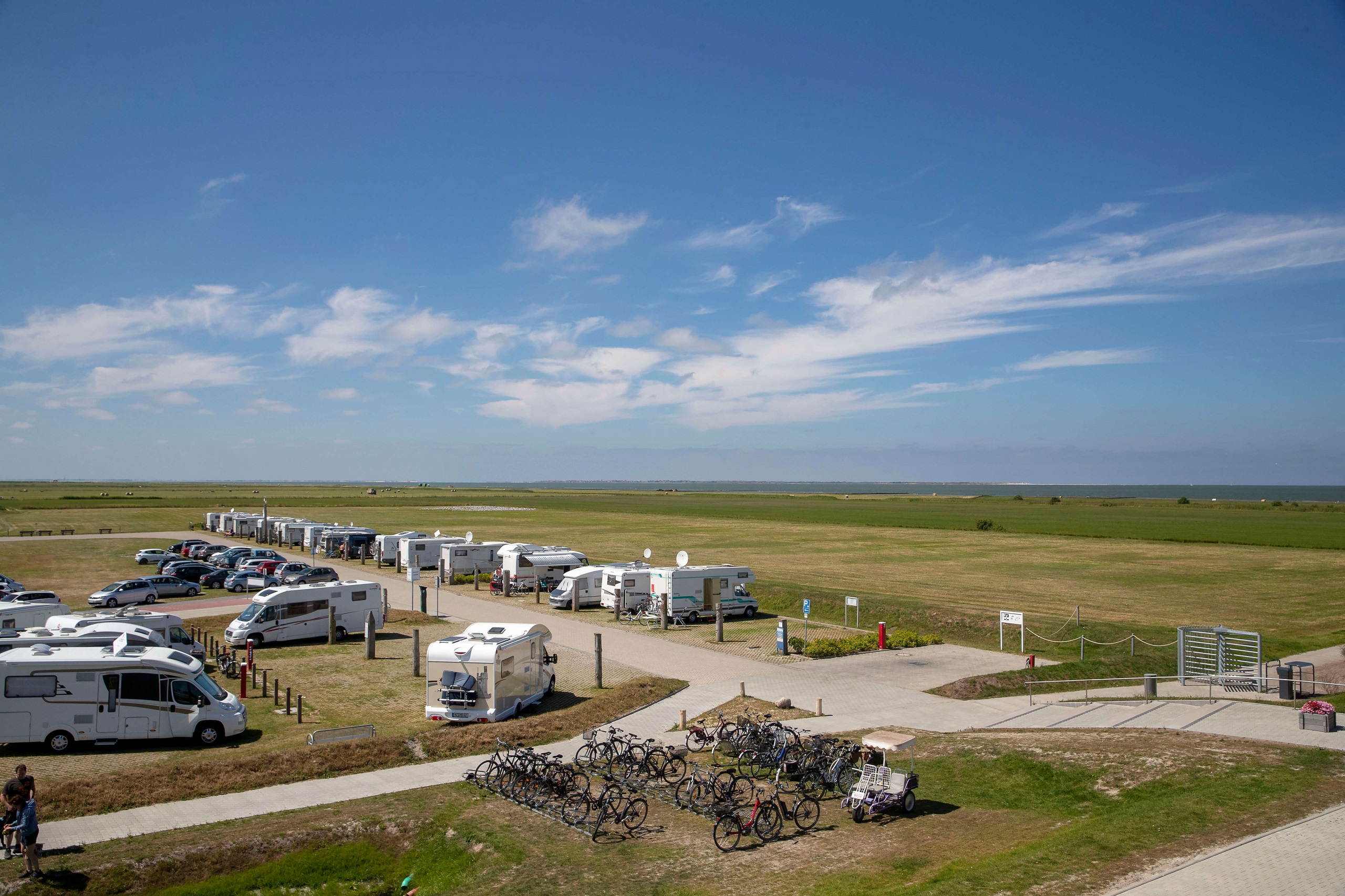38 Stellflächen auf Rasengittersteinen, direkt im Deichvorland am Nationalpark Niedersächsisches Wattenmeer gelegen, zwischen Drachenwiese und Seedeich stehen zur Verfügung. 27 Plätze sind 5 m x 10 m groß, 11 Plätze 5 m x 7 m. Sie sind durch Dalben voneinander getrennt. Für jeden Platz steht ein Stromanschluss zur Verfügung. Ver- und Entsorgung vorhanden. Die Anmeldung erfolgt in der Rezeption des Campingplatzes, wo es auch Brötchen gibt.
