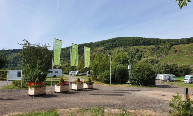 Ca. 200 Meter außerhalb vom Weinort Pünderich befindet sich der Wohnmobilstellplatz für 80 Mobile inmitten der Natur. Der Stellplatz ist unweit der Mosel gelegen und bietet einen wunderschönen Blick auf die Mosel, den Weinbergen und das längste Hangviadukt Europas, auf der anderen Moselseite. leicht abschüssige Stellplätze die zwischen mittelgroßen Apfelbäumen liegen. Große Spielplatz und Liegewiese direkt nebenan. Eine fantastische Auswahl an Rad- und Wanderwegen. Am Platz: eine Überfahrbare Entsorgungsanlage für Brauchwasser, Entsorgung für Chemie-Toilette und eine Frischwasser Versorgung. Stromanschlüsse von 6 Amp. (ca. 1300 Watt), Toiletten, Duschen und Kostenloses WLAN auf allen Stellplätzen. Der Wohnmobilplatz ist voll automatisiert, Sie fahren durch der Einfahrtsschranke, genießen alle Service Leistungen sofort und bezahlen am Automat. (nur Kartezahlung). Reservieren ist nicht möglich. Video-Überwachung, Stellplatz ist beleuchtet. Hunde sind willkommen.
