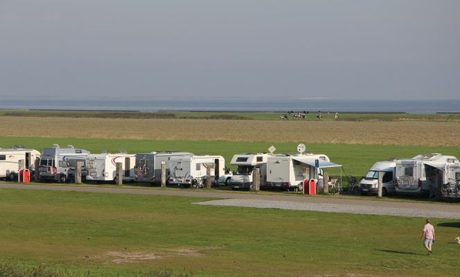 38 Stellflächen auf Rasengittersteinen, direkt im Deichvorland am Nationalpark Niedersächsisches Wattenmeer gelegen, zwischen Drachenwiese und Seedeich stehen zur Verfügung. 27 Plätze sind 5 m x 10 m groß, 11 Plätze 5 m x 7 m. Sie sind durch Dalben voneinander getrennt. Für jeden Platz steht ein Stromanschluss zur Verfügung. Ver- und Entsorgung vorhanden. Die Anmeldung erfolgt in der Rezeption des Campingplatzes, wo es auch Brötchen gibt.